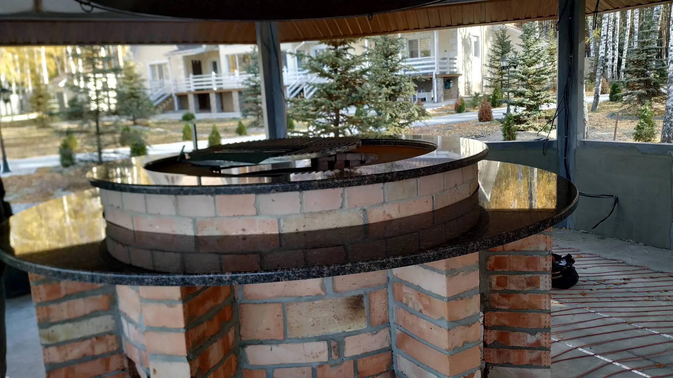 У цьому проєкті ми реалізували тандир із натурального граніту, який слугує не лише функціональною східною піччю, а й органічно завершує всю конструкцію альтанки. Камінь гармонійно поєднується з теплою текстурою цегляної кладки, підкреслюючи надійність та естетику кожного елемента.