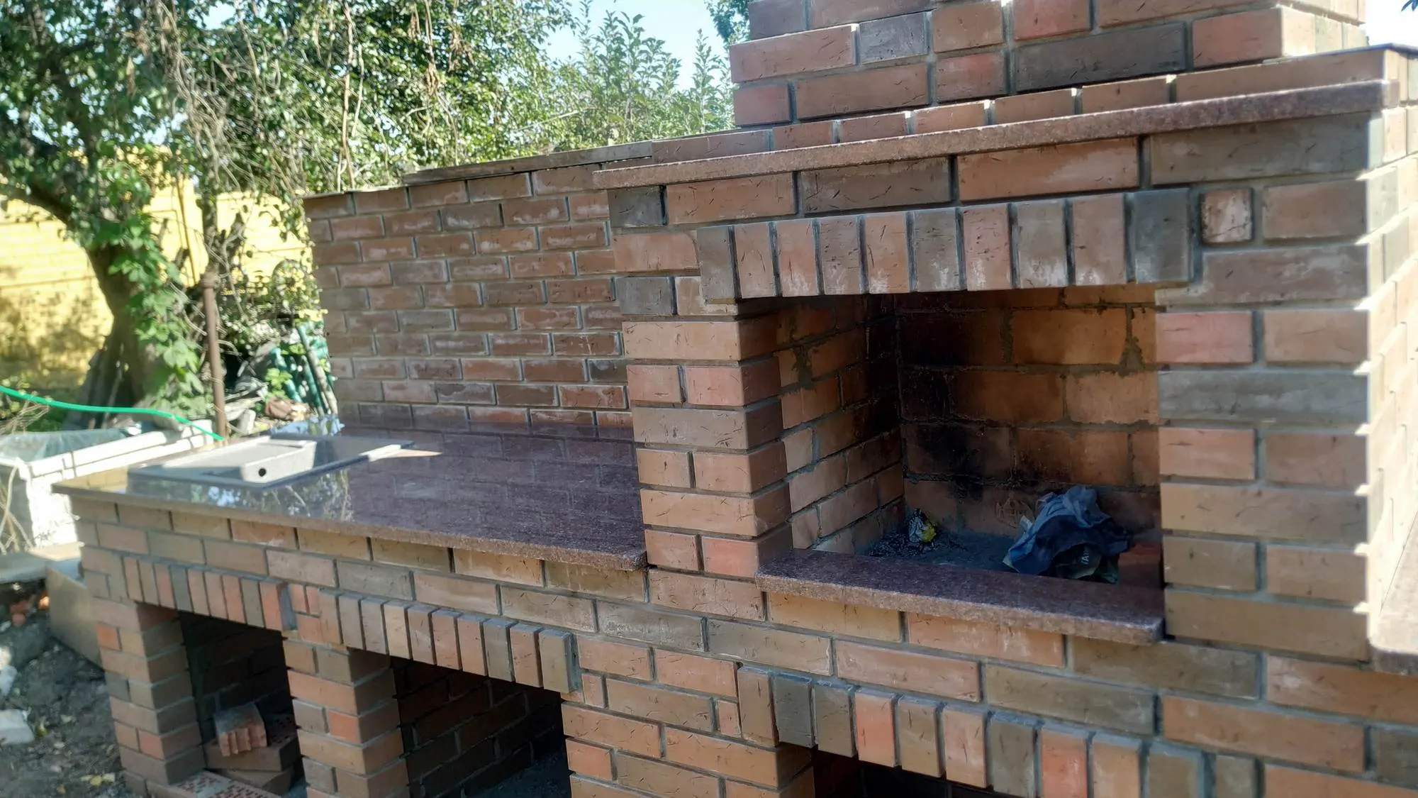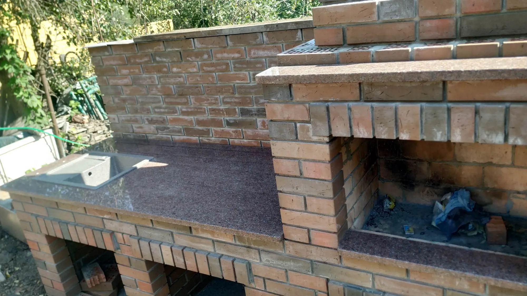 Цей барбекю-комплекс збудовано з цегли та доповнено масивною стільницею з натурального каменю, яка виконує ключову функцію в усьому проєкті. Стільниця проходить уздовж усієї конструкції, включаючи ділянку з мийкою, піччю і підготовчою зоною. Саме вона є основним робочим простором, де відбувається приготування, розміщення посуду, продуктів і аксесуарів для готування.