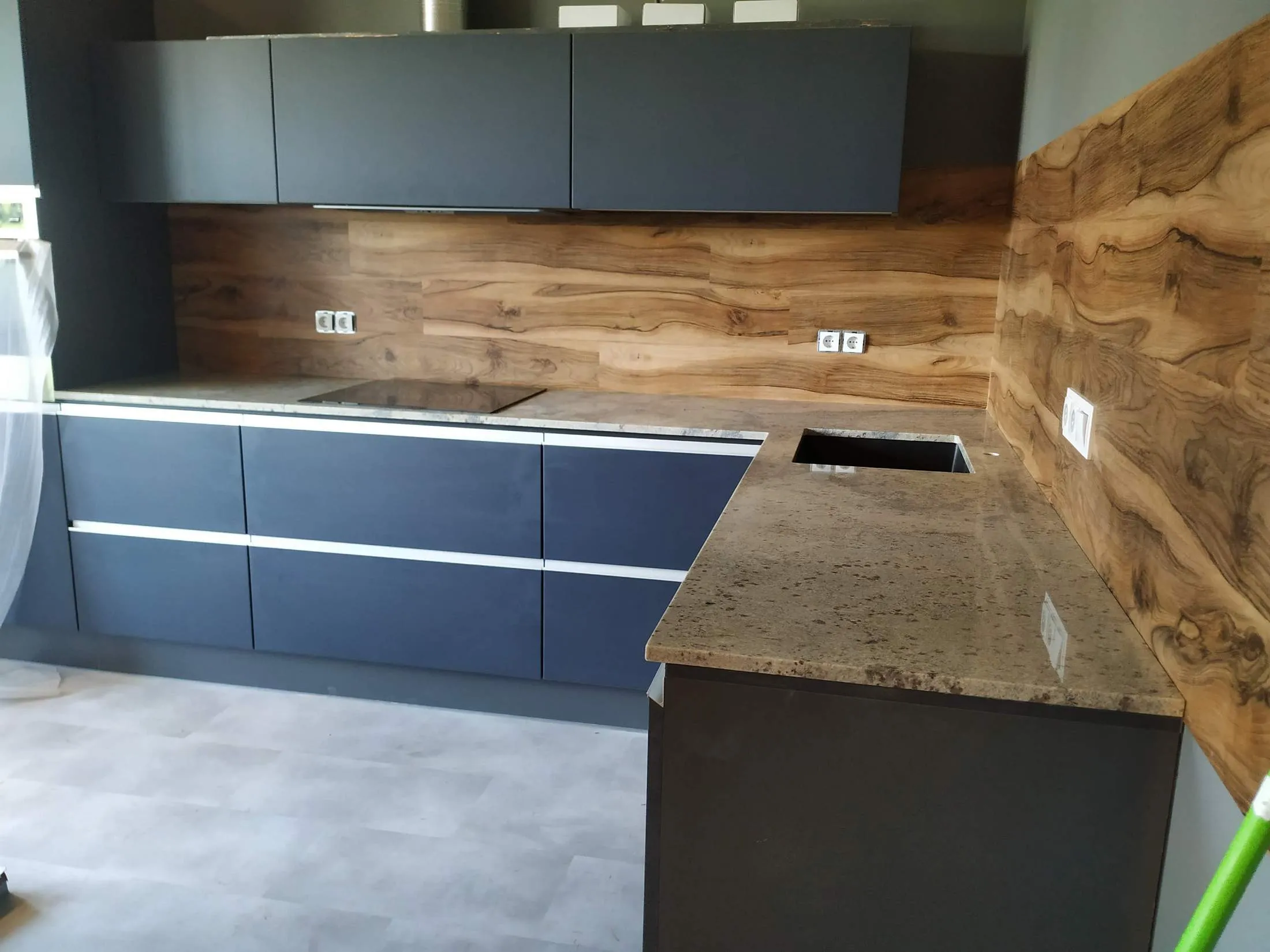Стільниця виготовлена з міцного натурального каменю з теплим бежево-коричневим відтінком, який гармонійно поєднується з дерев’яною фоновою панеллю та матовими фасадами кухні. Камінь має природний візерунок і поліровану поверхню, яка не тільки естетично приваблива, але й дуже практична — вона стійка до вологи, подряпин, перепадів температур і механічних навантажень.