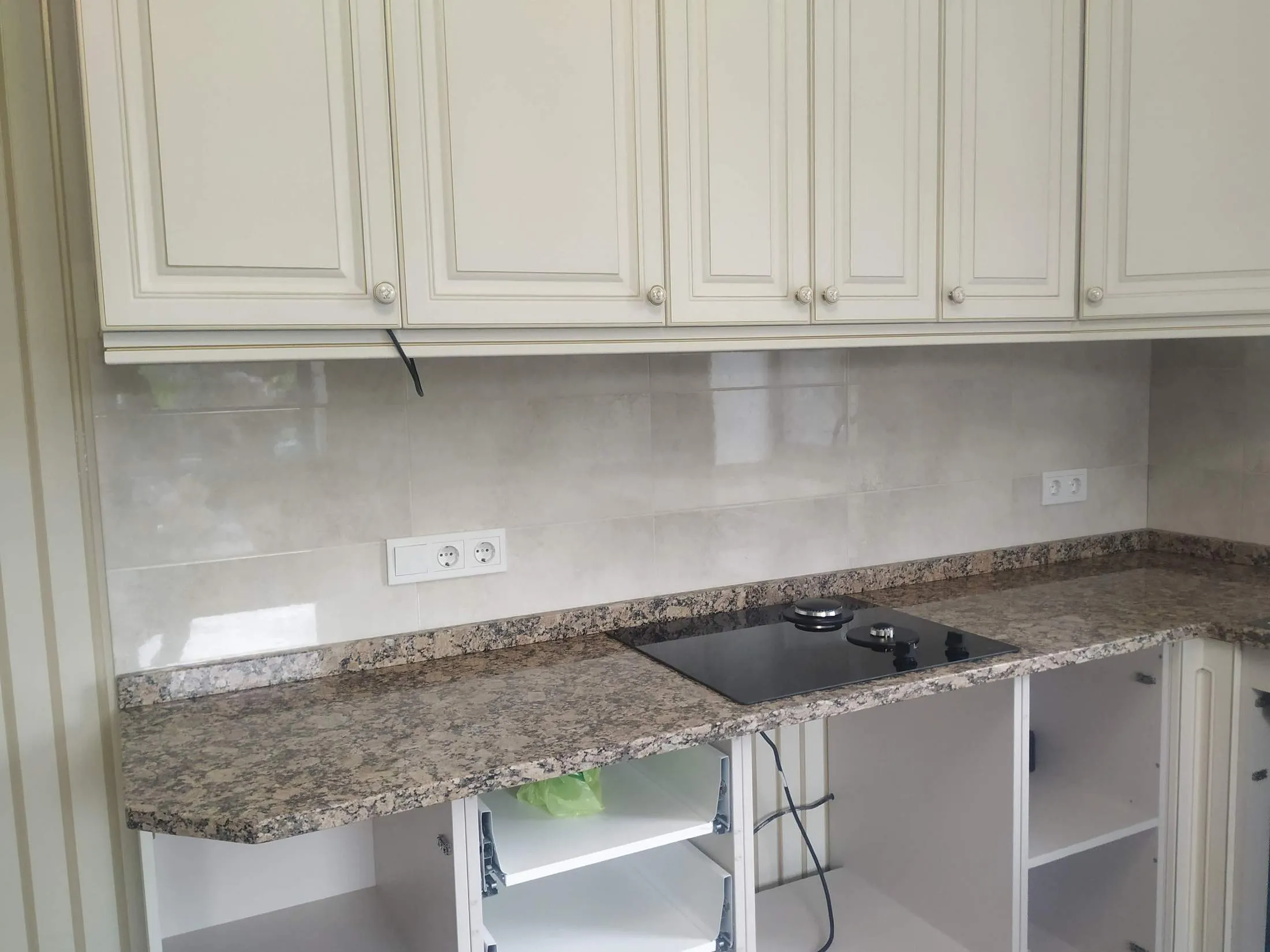 У даному випадку граніт має насичений природний малюнок, що гармонійно поєднується зі світлими фасадами меблів. Поверхня ідеально відполірована до блиску, що додає простору легкості та чистоти.