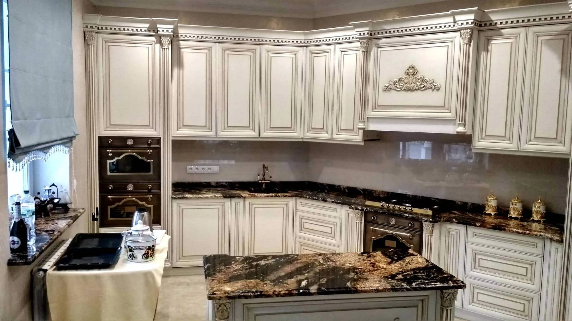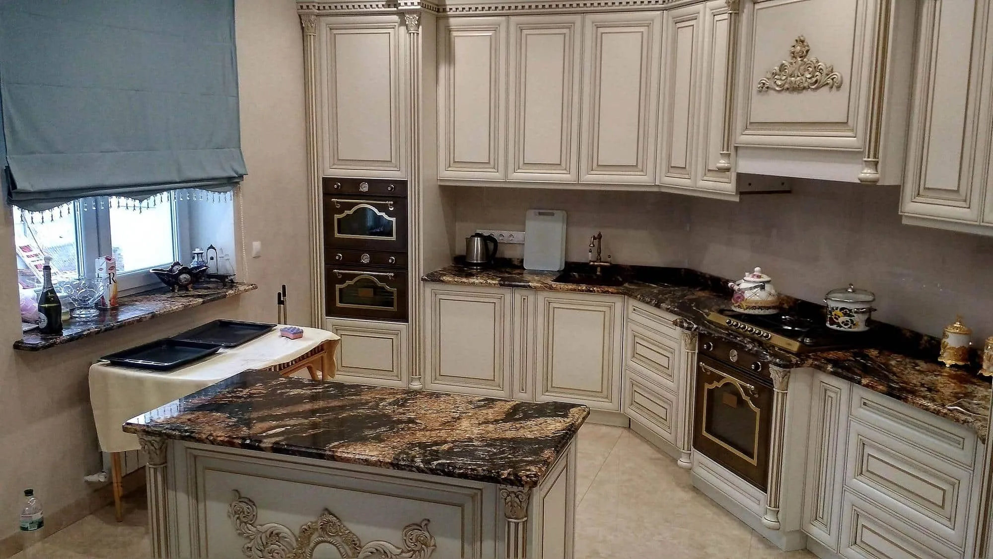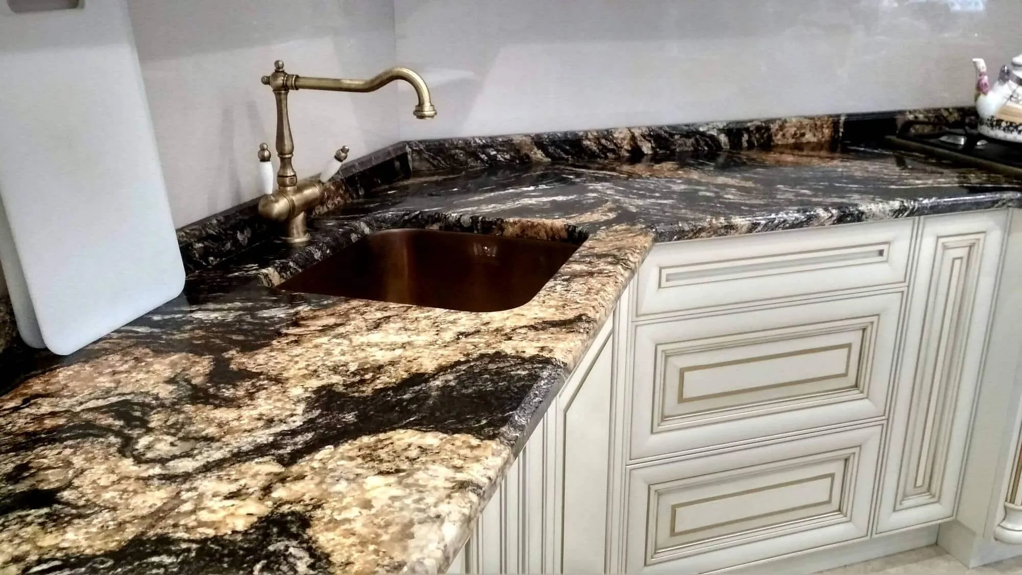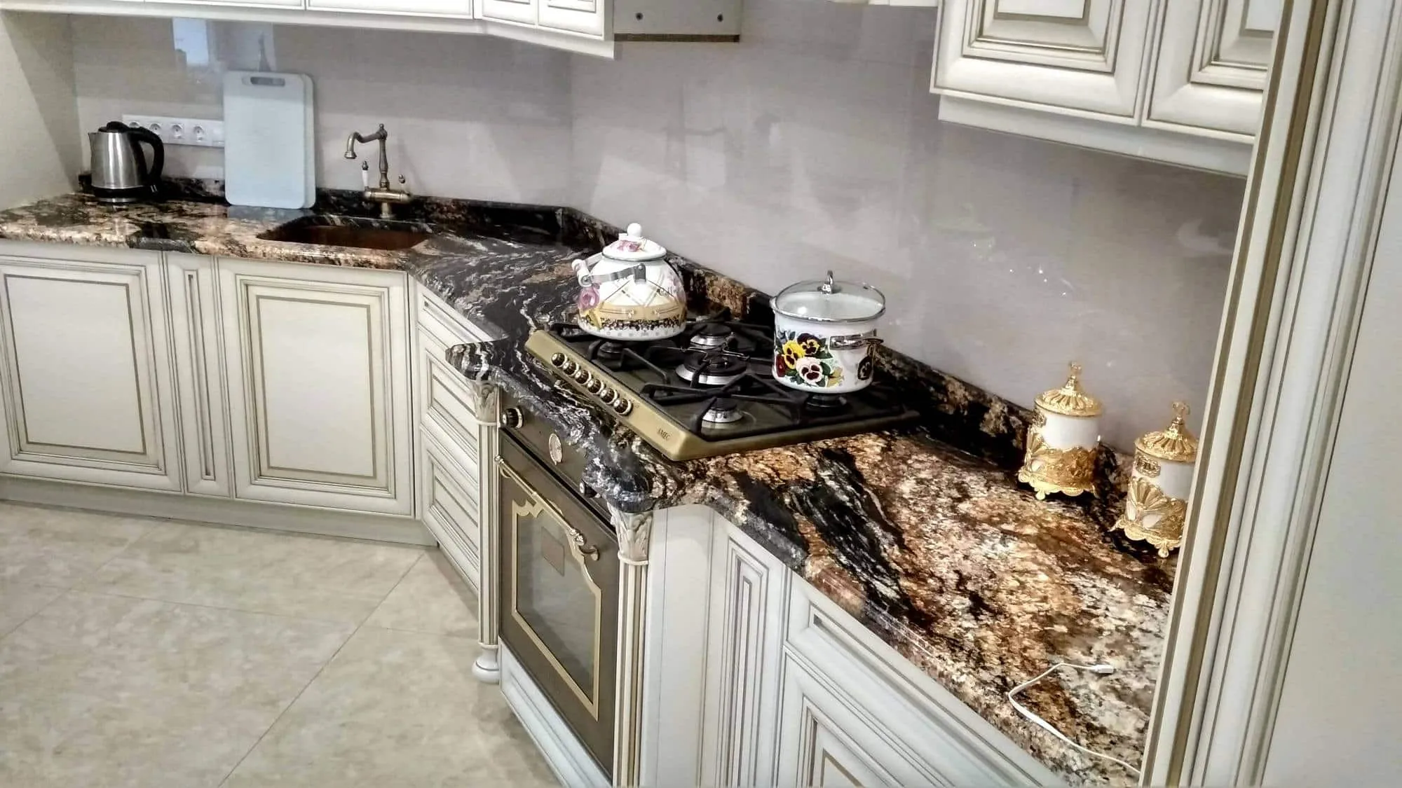 Стільниця з граніту для класичної кухні. Кам’яна стільниця Golden Thunder на замовлення. Натуральний камінь у кухонному інтер’єрі.