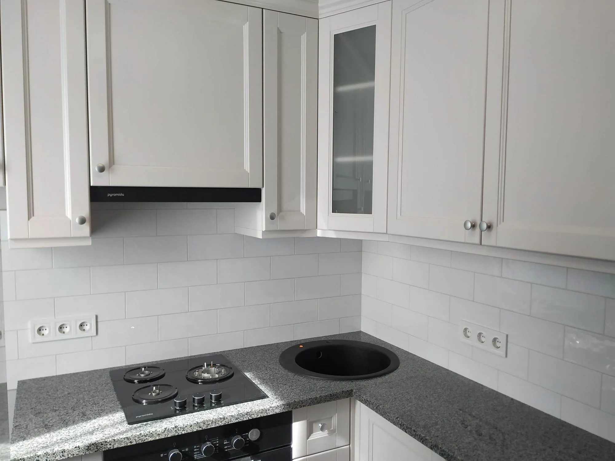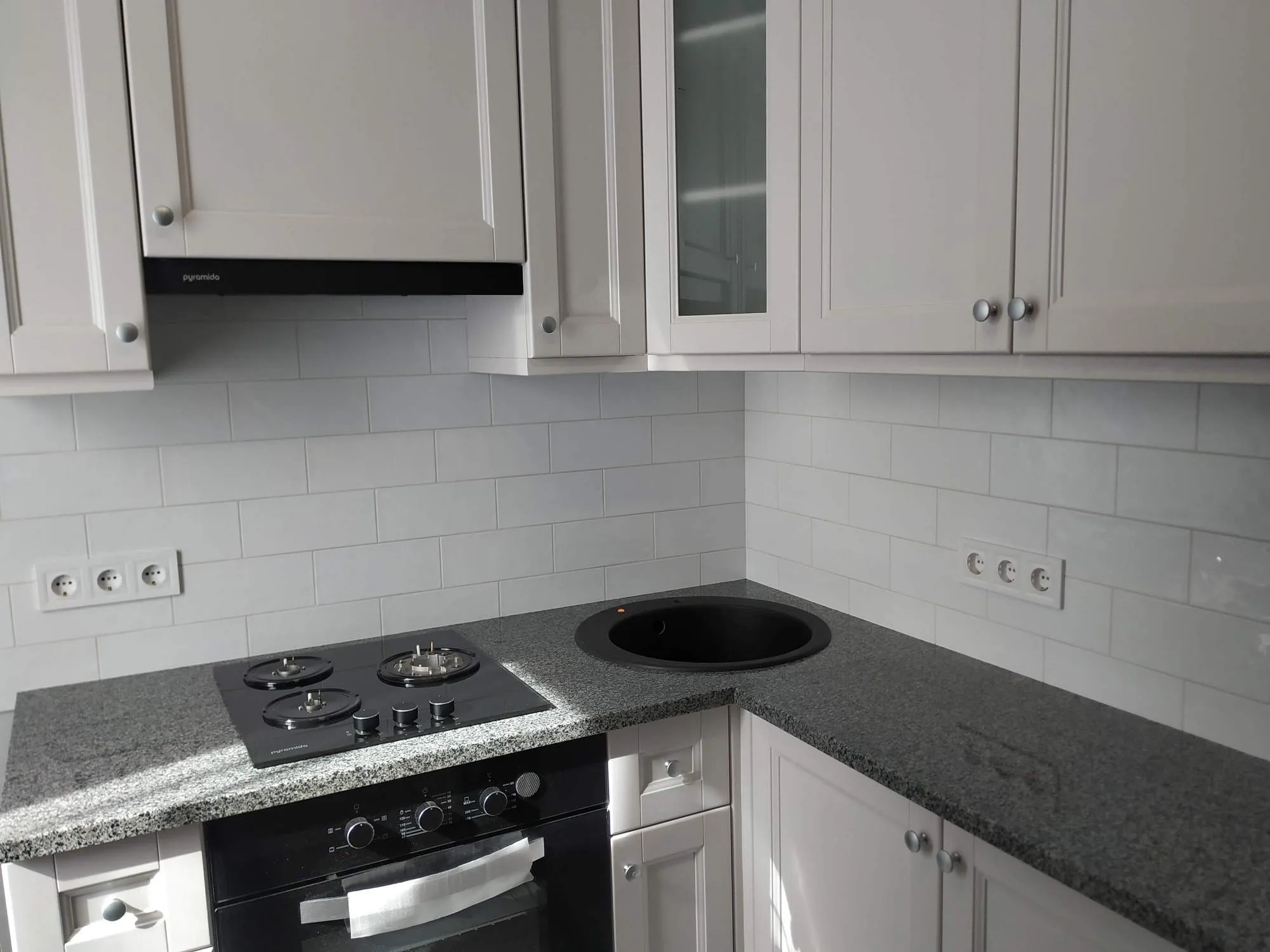 Компактна кутова кухня з ідеальним поєднанням практичності та естетики досягнуто завдяки гранітній стільниці з натурального каменю. Це рішення чудово підходить для невеликих приміщень, де важливо максимально ефективно використати кожен сантиметр робочого простору.