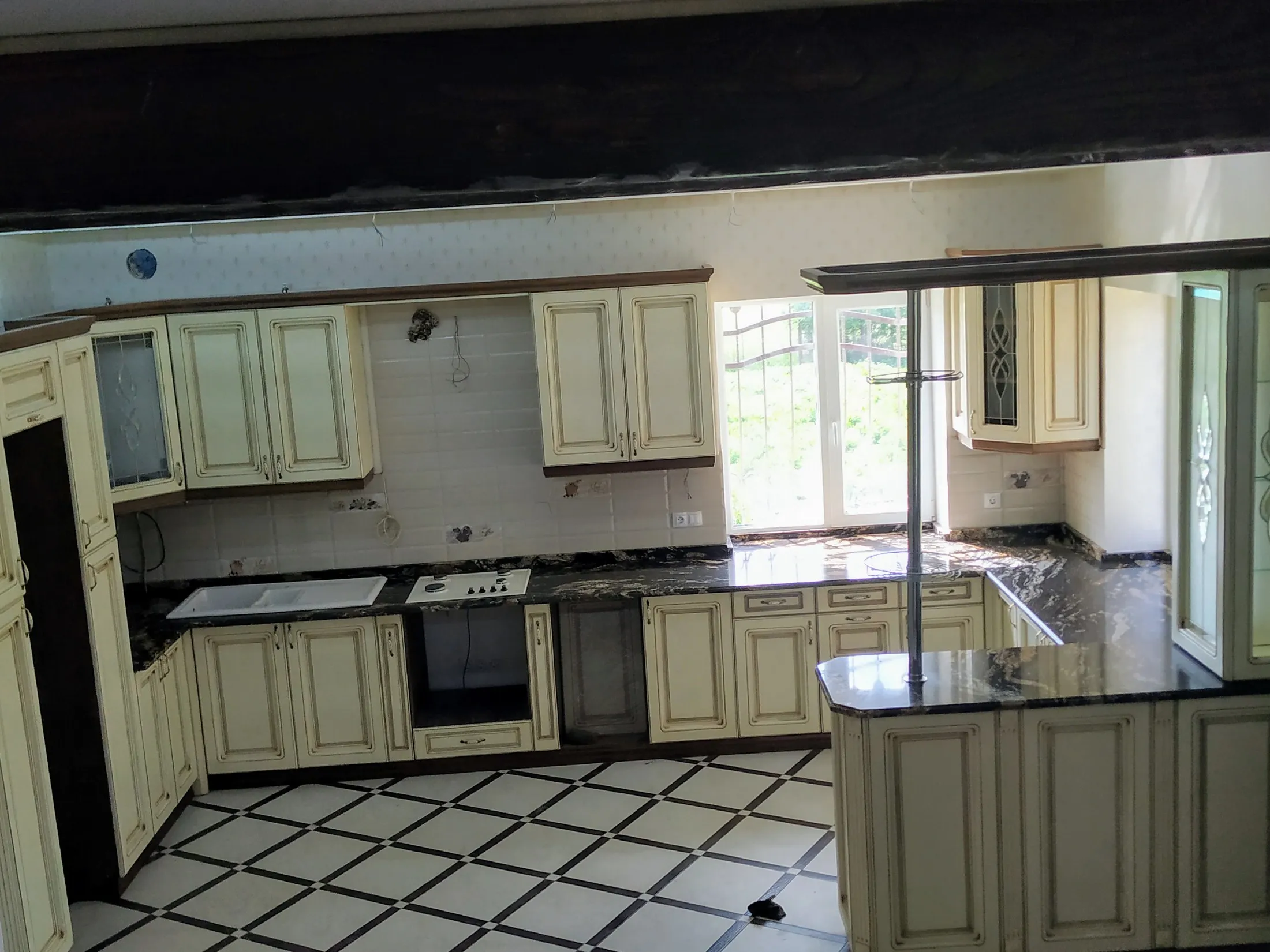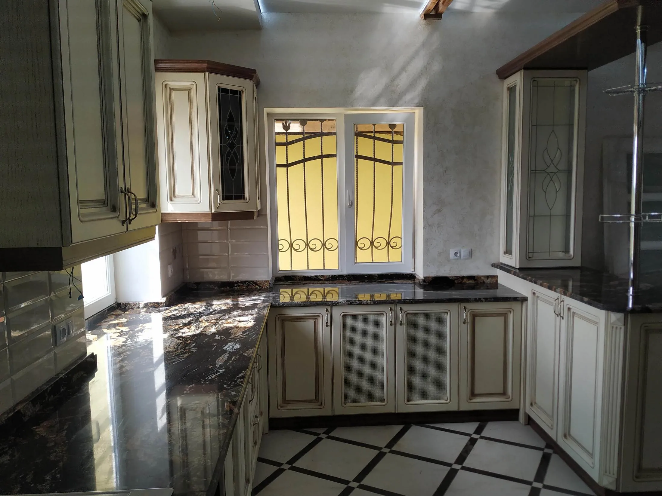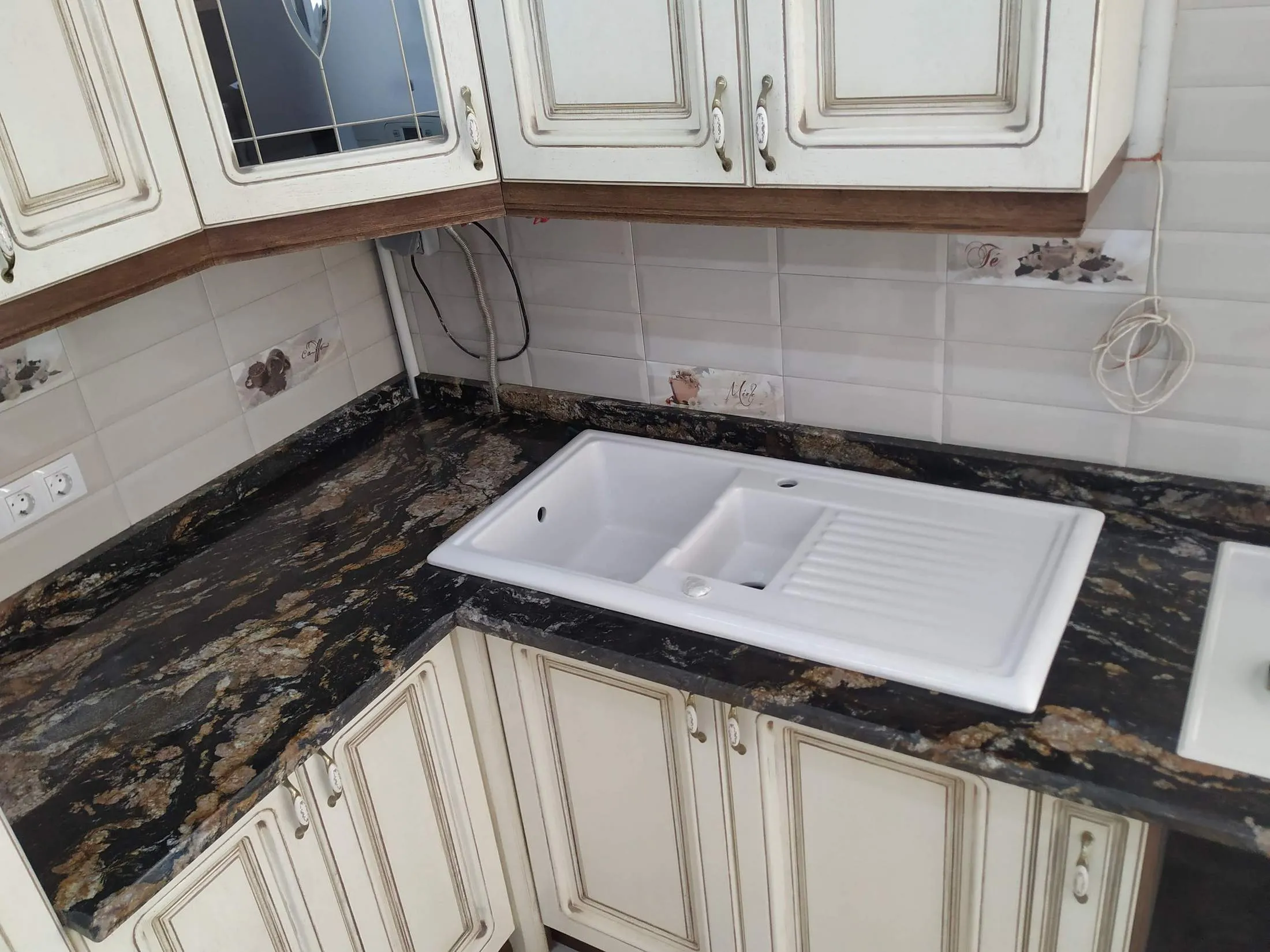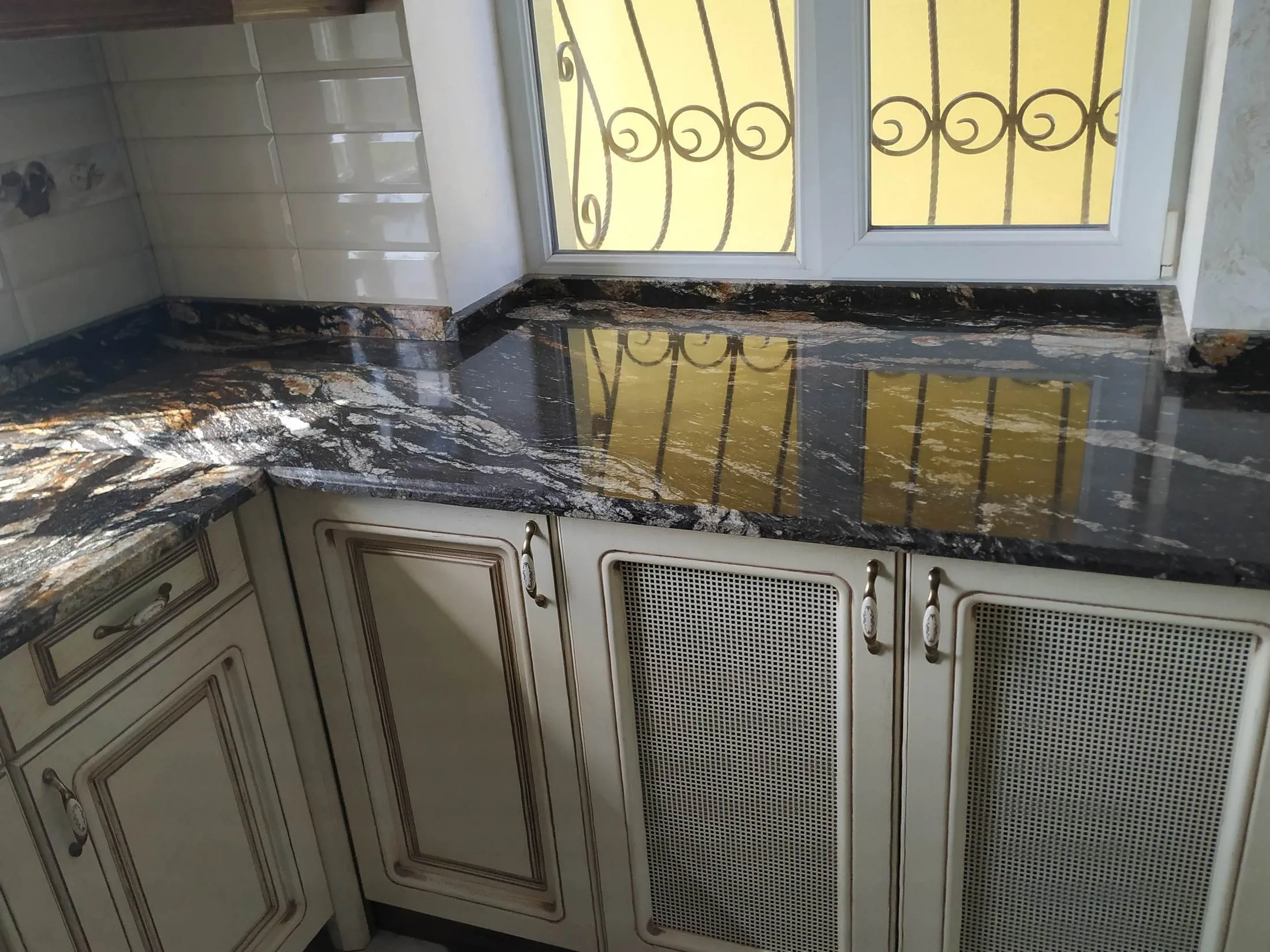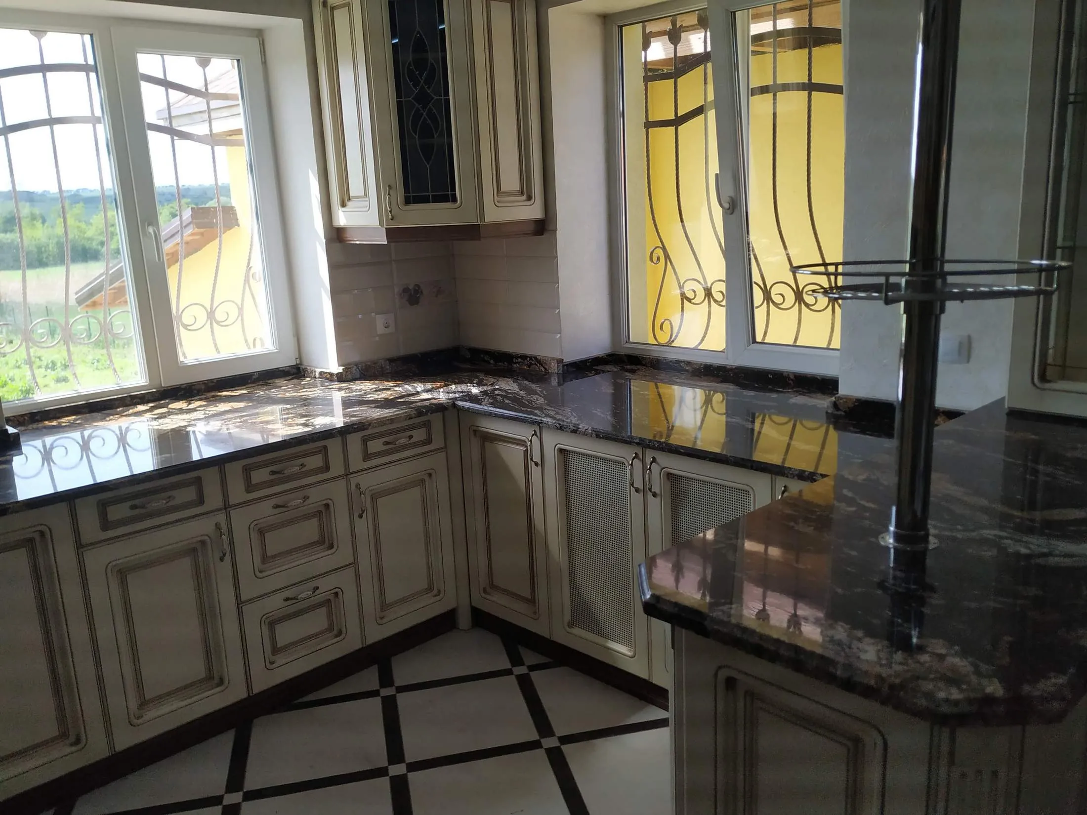 У цьому проєкті представлено встановлення кухонної стільниці з натурального каменю в просторій кухні з класичними меблями кольору слонової кістки. Основний акцент зроблено на використанні високоякісного природного матеріалу — мармуру чорного кольору з білими та сірими прожилками, який додає елегантності й розкоші всьому інтер’єру.