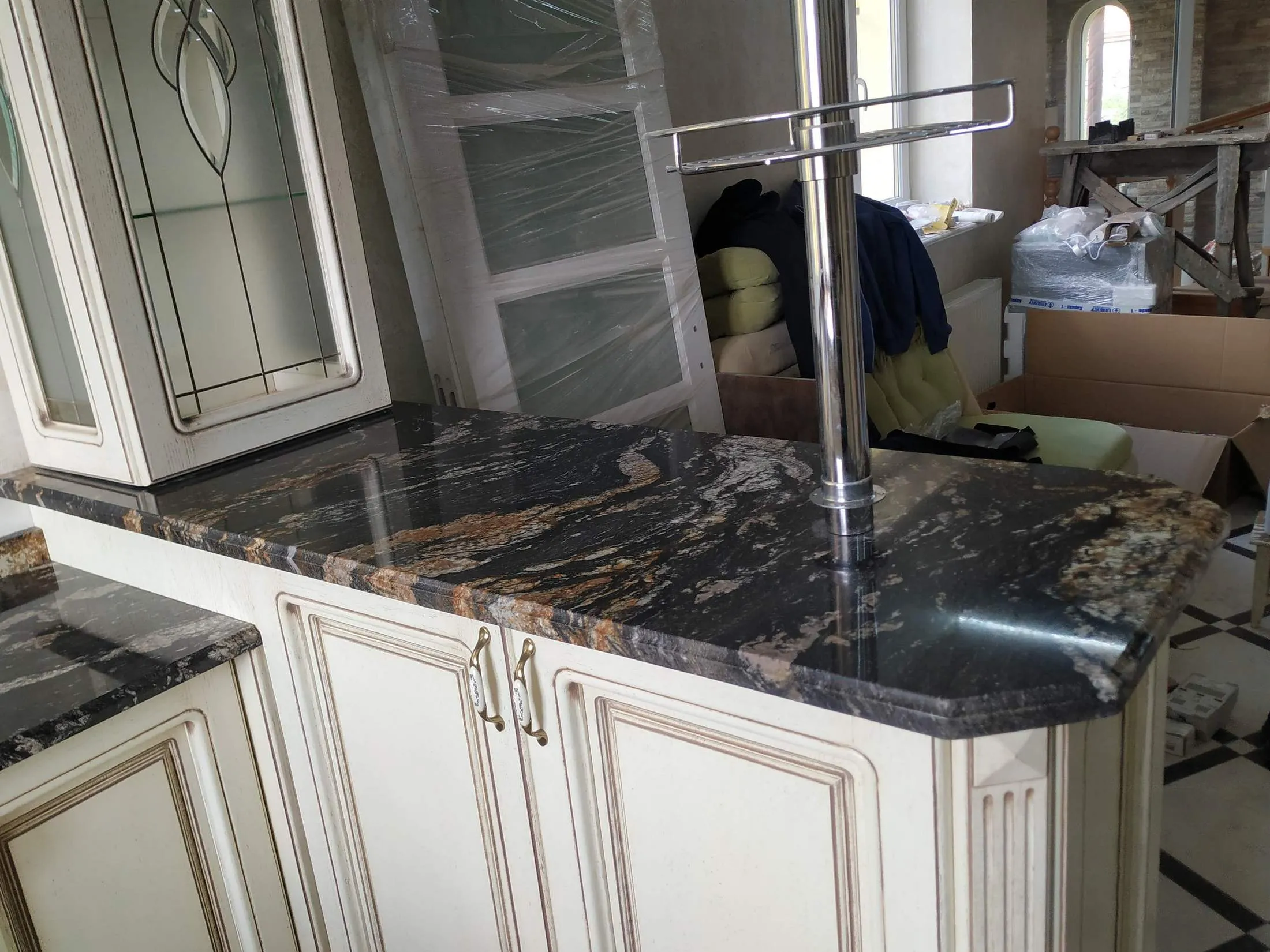 Виготовлення та встановлення кам’яної стільниці з натурального каменю для кухні. Мармурова чорна стільниця з глянцем. Класичний інтер’єр, індивідуальний проєкт.