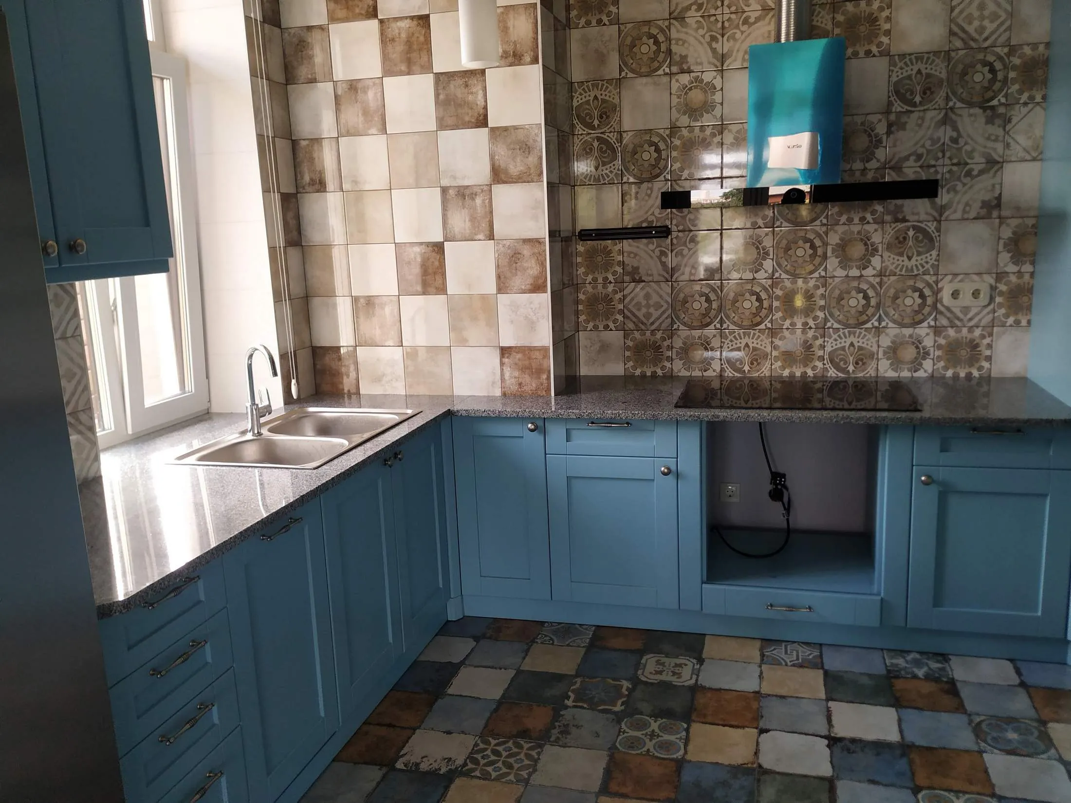 У цьому проєкті ми виготовили та встановила кухонну стільницю з натурального сірого граніту. Об’єкт розташовано у світлій сучасній кухні, оформленій у середземноморському стилі — з блакитними фасадами, декоративною плиткою та мозаїчною підлогою. Сірий граніт з дрібнозернистою текстурою ідеально доповнює це середовище, надаючи інтер’єру витонченості, стилю та практичності.