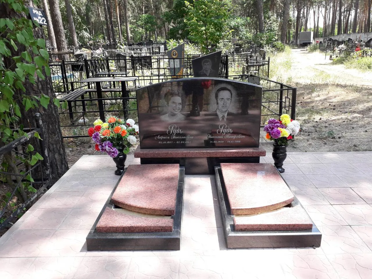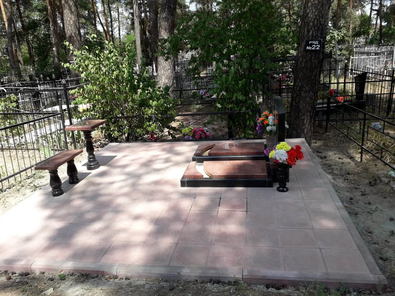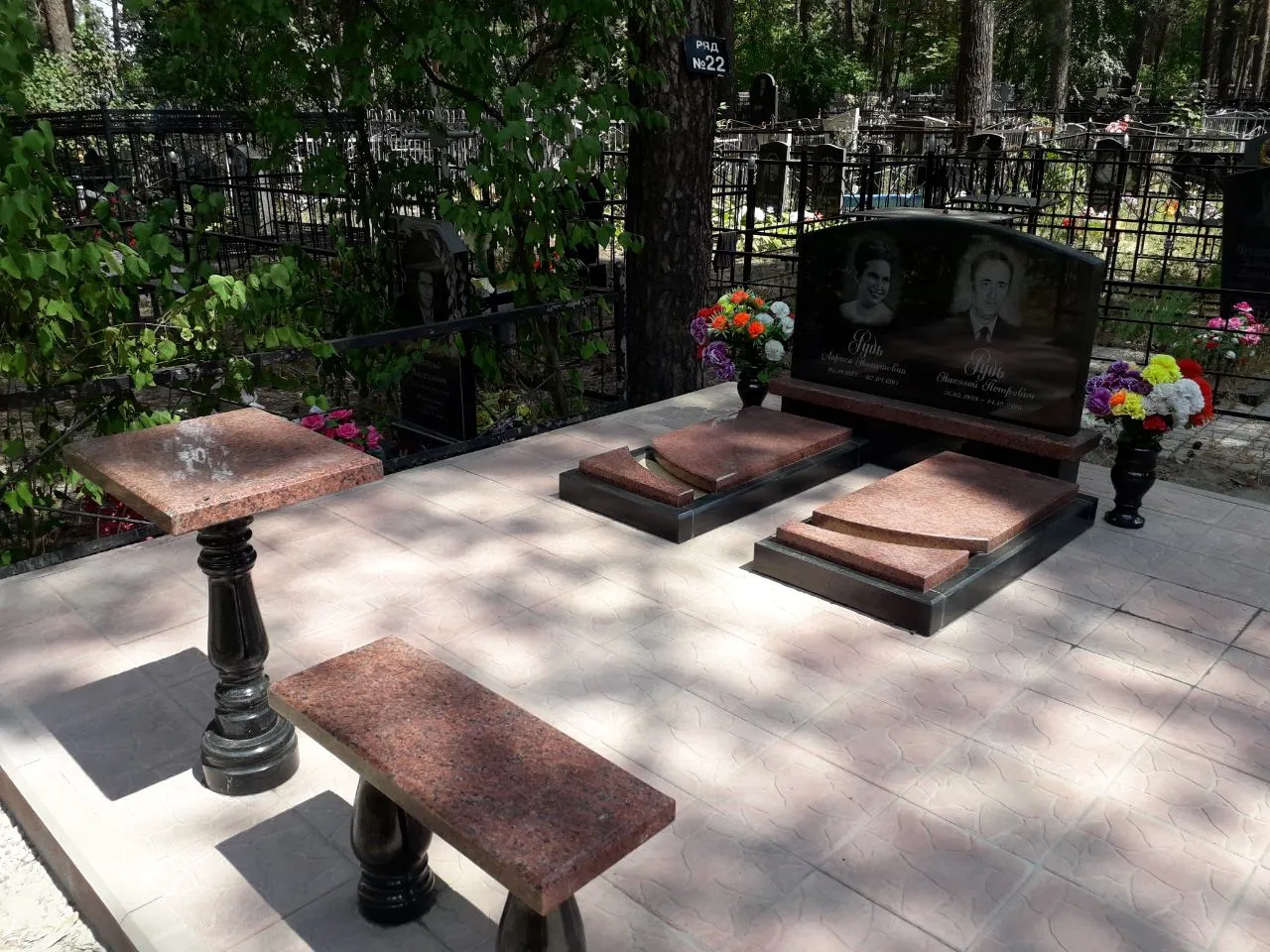 Реалізовано упорядкований меморіальний комплекс з натурального граніту для сімейного поховання. Композиція виконана з дотриманням всіх канонів естетики, зручності та архітектурної гармонії. Основний матеріал — полірований граніт бордово-коричневого відтінку в поєднанні з чорним каменем на п’єдесталі.