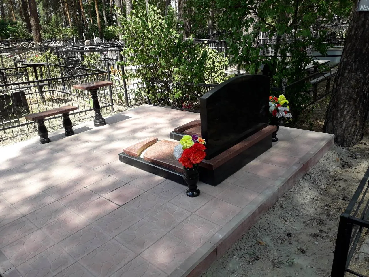 Майданчик облицьований плиткою з легким рельєфом, що забезпечує комфортне переміщення і надає доглянутий зовнішній вигляд. Всі монтажні роботи — від установки пам’ятника до укладання плитки і фіксації елементів благоустрою — були виконані з точністю і дотриманням технології.