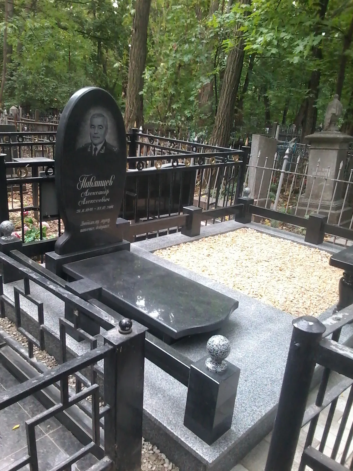 Пам’ятник виготовлено з чорного полірованого граніту — це класичний вибір для надгробків, який поєднує в собі стриману елегантність і високу зносостійкість. Гравіювання виконується методом піскоструйного або лазерного нанесення — на замовлення клієнта. Спинка пам’ятника має овальну форму з портретом, ПІБ та датами — все виконано з великою точністю.