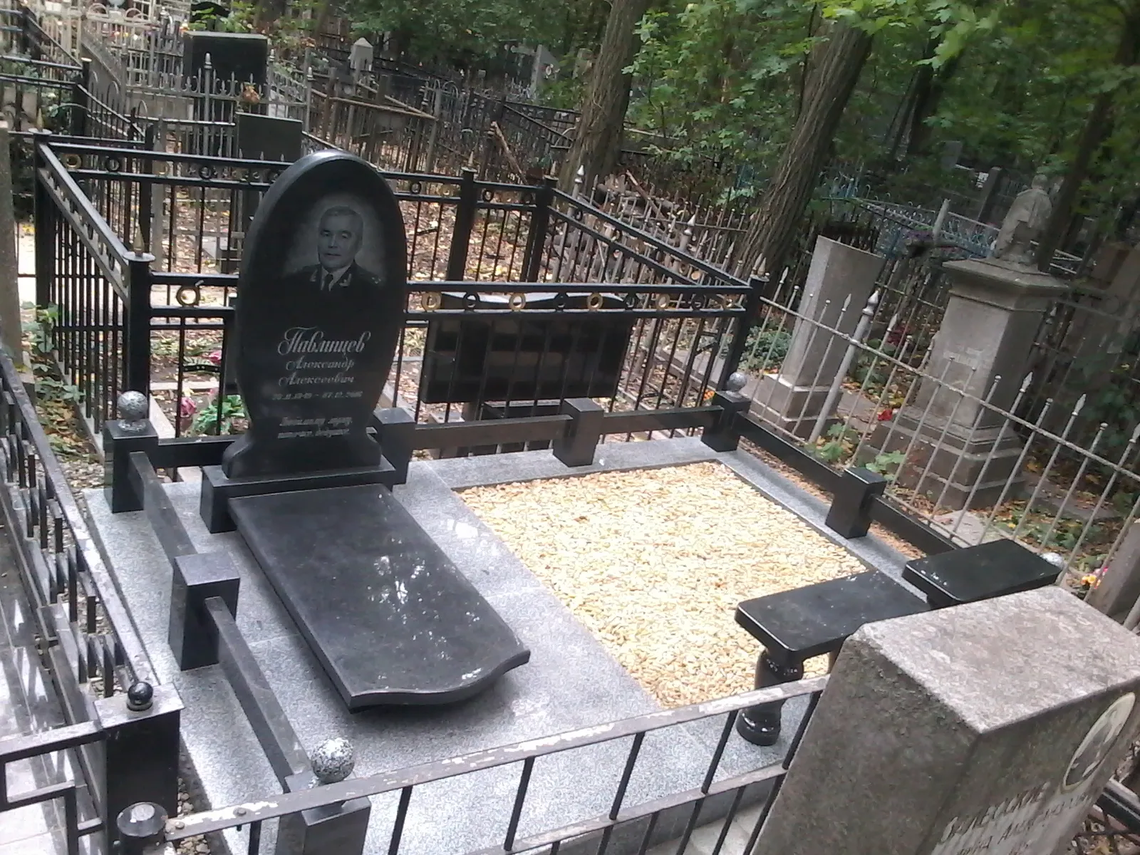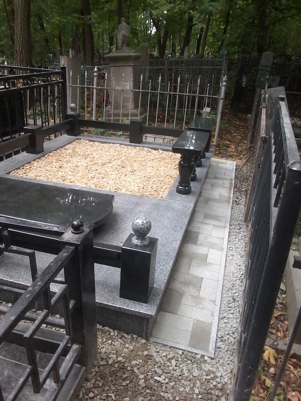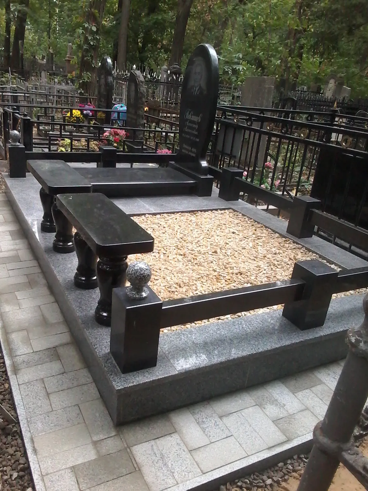Цей меморіальний комплекс виконаний з високоякісного натурального граніту та включає пам’ятник із гравіюванням, огорожу, декоративну гальку та лавки, що додають місцю спокою і завершеності. Вся композиція встановлена на укладеній тротуарній плитці, що також виготовлена з каменю, що забезпечує довговічність і естетичну завершеність простору.