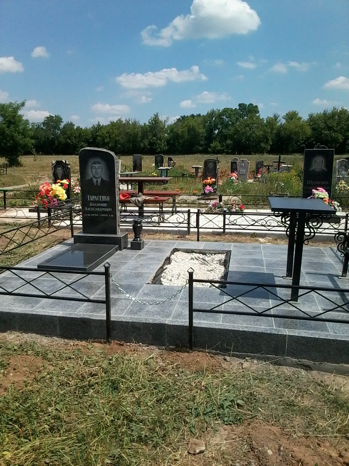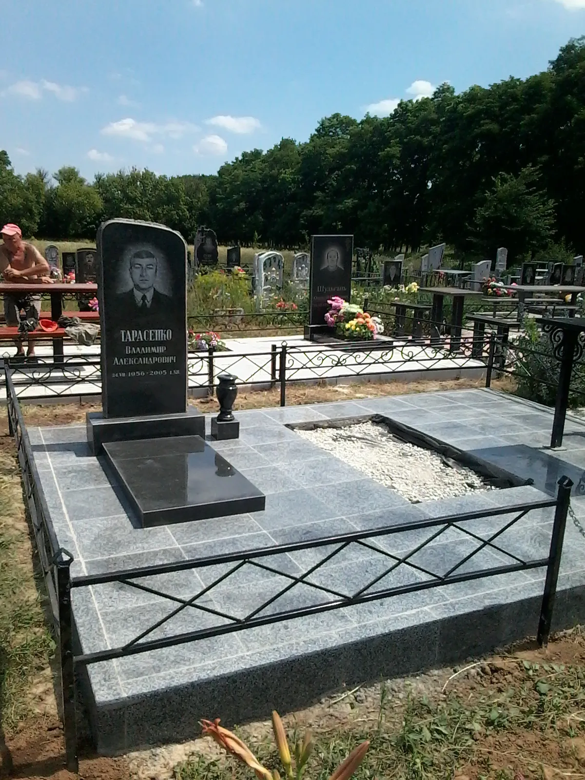 Цей меморіальний комплекс — приклад повного благоустрою місця поховання з використанням натурального граніту. Композиція поєднує в собі естетику, функціональність та довговічність. Надгробок із портретом і написом встановлено вертикально, поруч горизонтальна надмогильна плита — усе виконано з високоякісного чорного граніту. Це природний камінь, який відомий своєю міцністю, морозостійкістю та здатністю зберігати вигляд десятиліттями.
