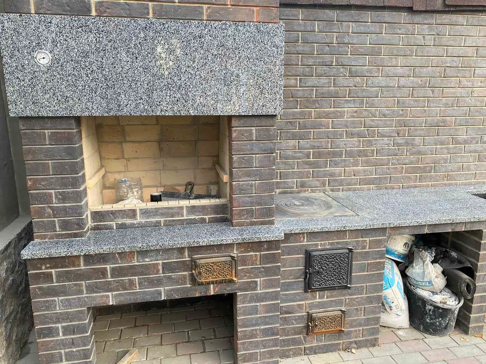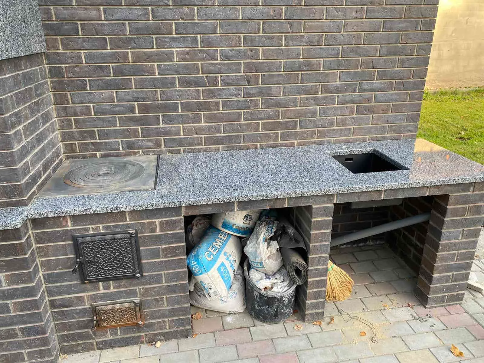 Этот проект представляет собой уличный барбекю-комплекс, полностью облицованный натуральным гранитом. Конструкция включает мангал, варочную поверхность (печь), гранитную столешницу с мойкой, а також облицовку дымохода.