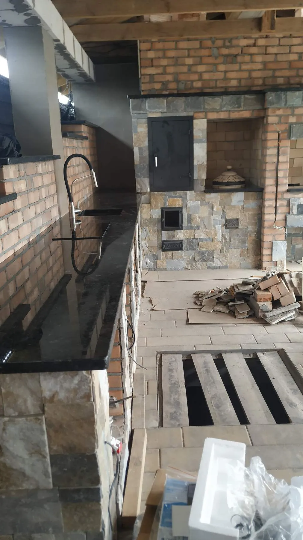 Этот проект представляет собой комплексную зону барбекю, в которой удалось поєднати эстетику природного камня с функціональністю повноцінної кухні. Центральним елементом стала велика стільниця з натурального чорного граніту — матеріалу, який не має рівних у вуличних умовах за міцністю, надійністю та красою.