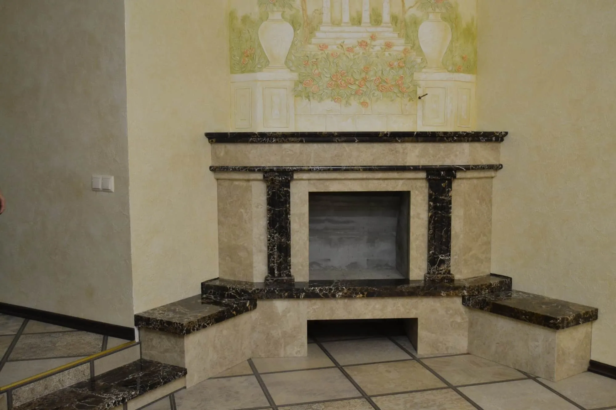 Этот проект демонстрирует изысканный камин в классическом стиле, выполненный из натурального мрамора. Основные материалы — темный мрамор Emperador Dark и светлый бежевый мрамор, которые создают контрастну гармонію кольору та текстури.
