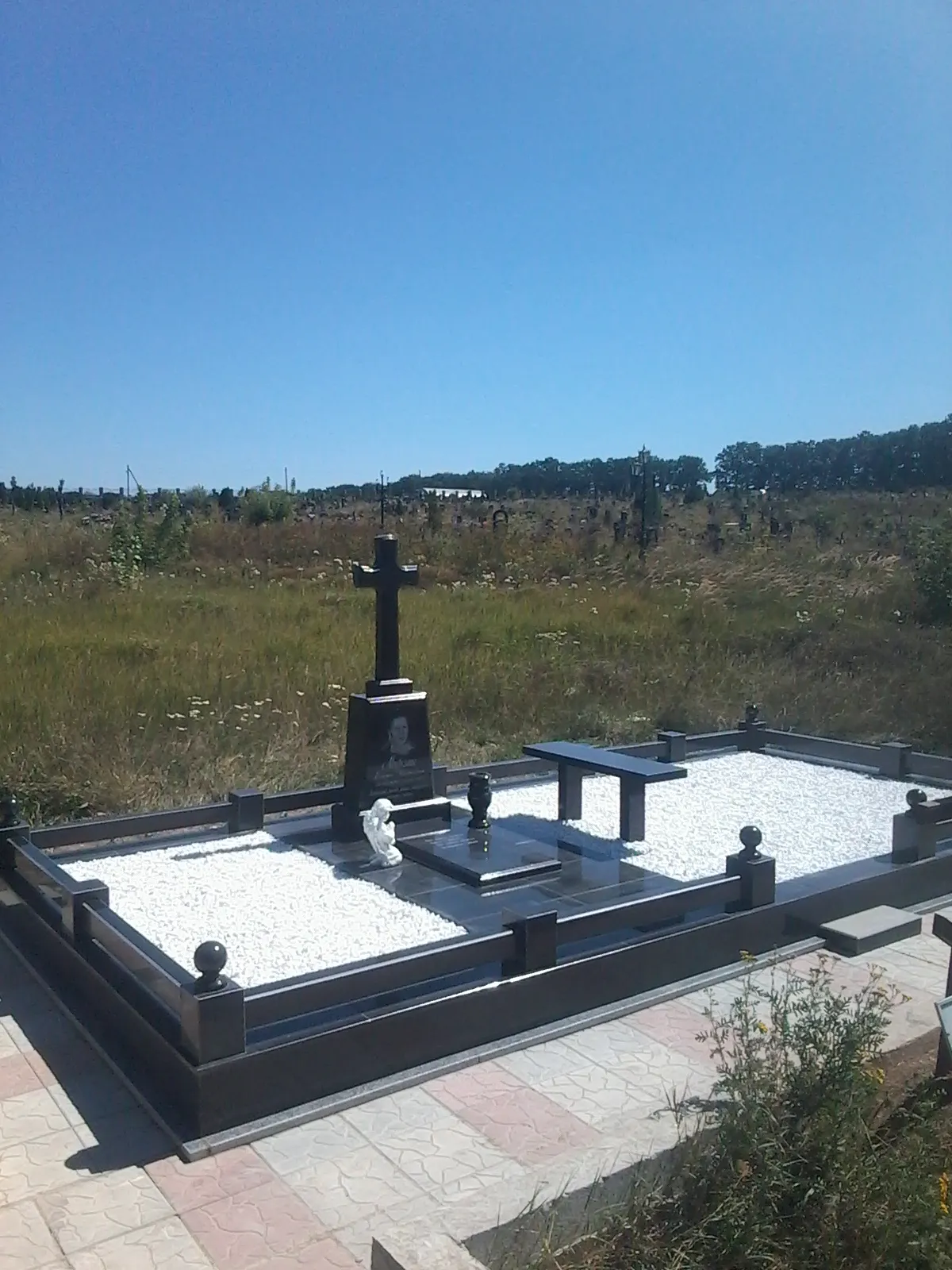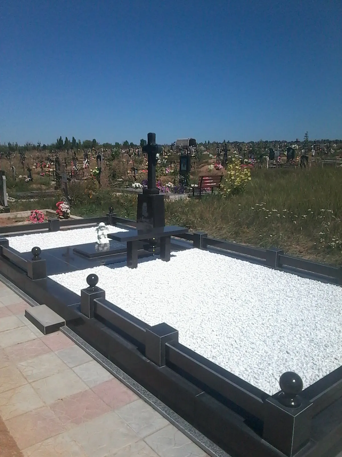 Изготовление и установка памятника из гранита с крестом, оградой и белой декоративной крошкой. Комплекс из натурального камня с гравировкой и благоустройством.