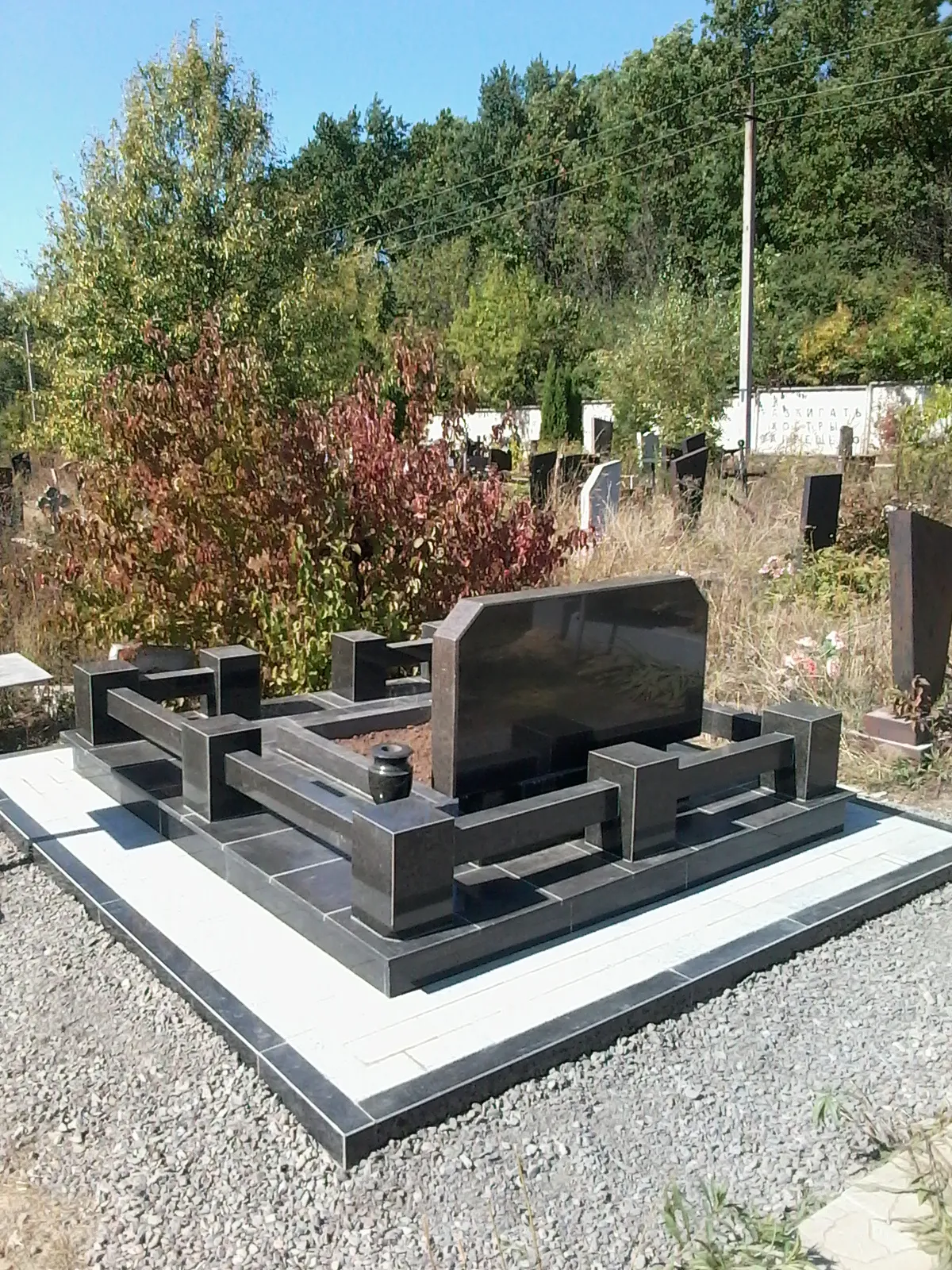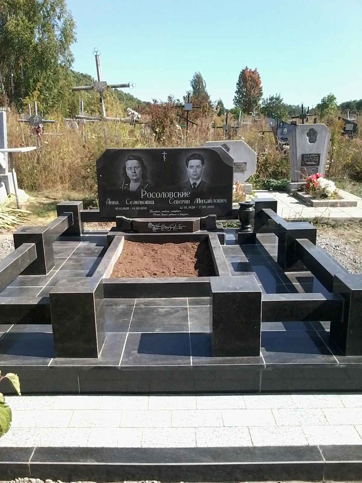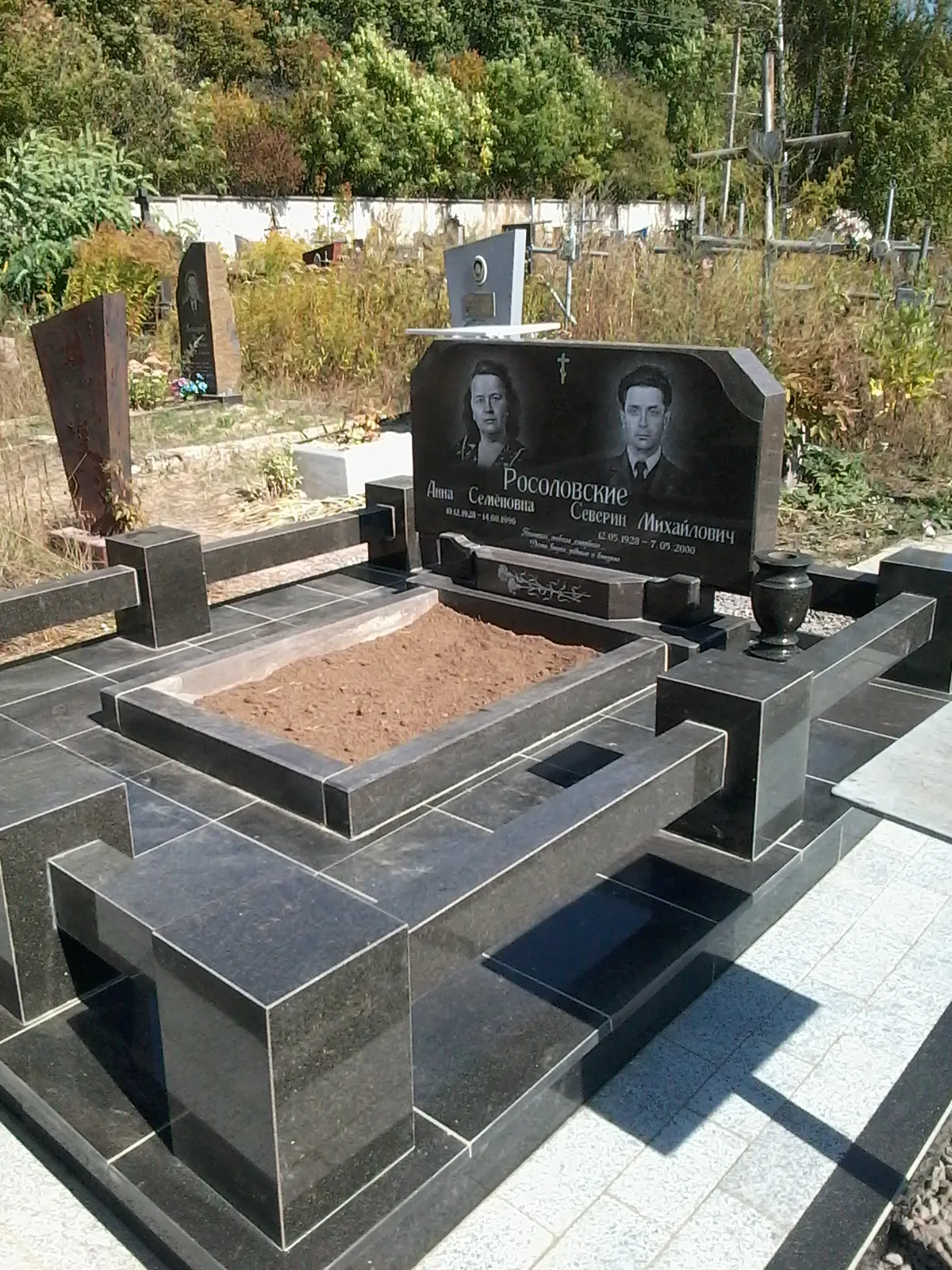 Этот мемориальный комплекс выполнен из высококачественного черного гранита, который отличается прочностью и благородным видом. Комплекс включает двойной вертикальный памятник с гравированными портретами, декоративное гранитное ограждение и полное облицовывание участка каменными плитами.