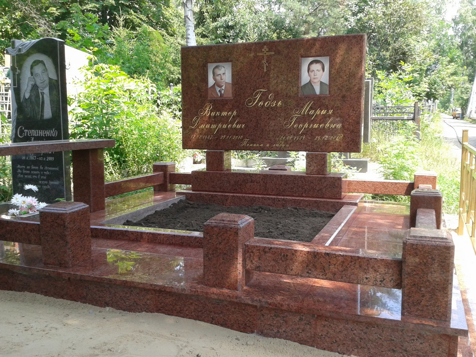 Вся площадка облицована полированным красным гранитом, с обрамлением из массивного камня, балясинами и декоративными опорами. Лавка, встроенная в конструкцию, служит практичным элементом для родственников и посетителей.